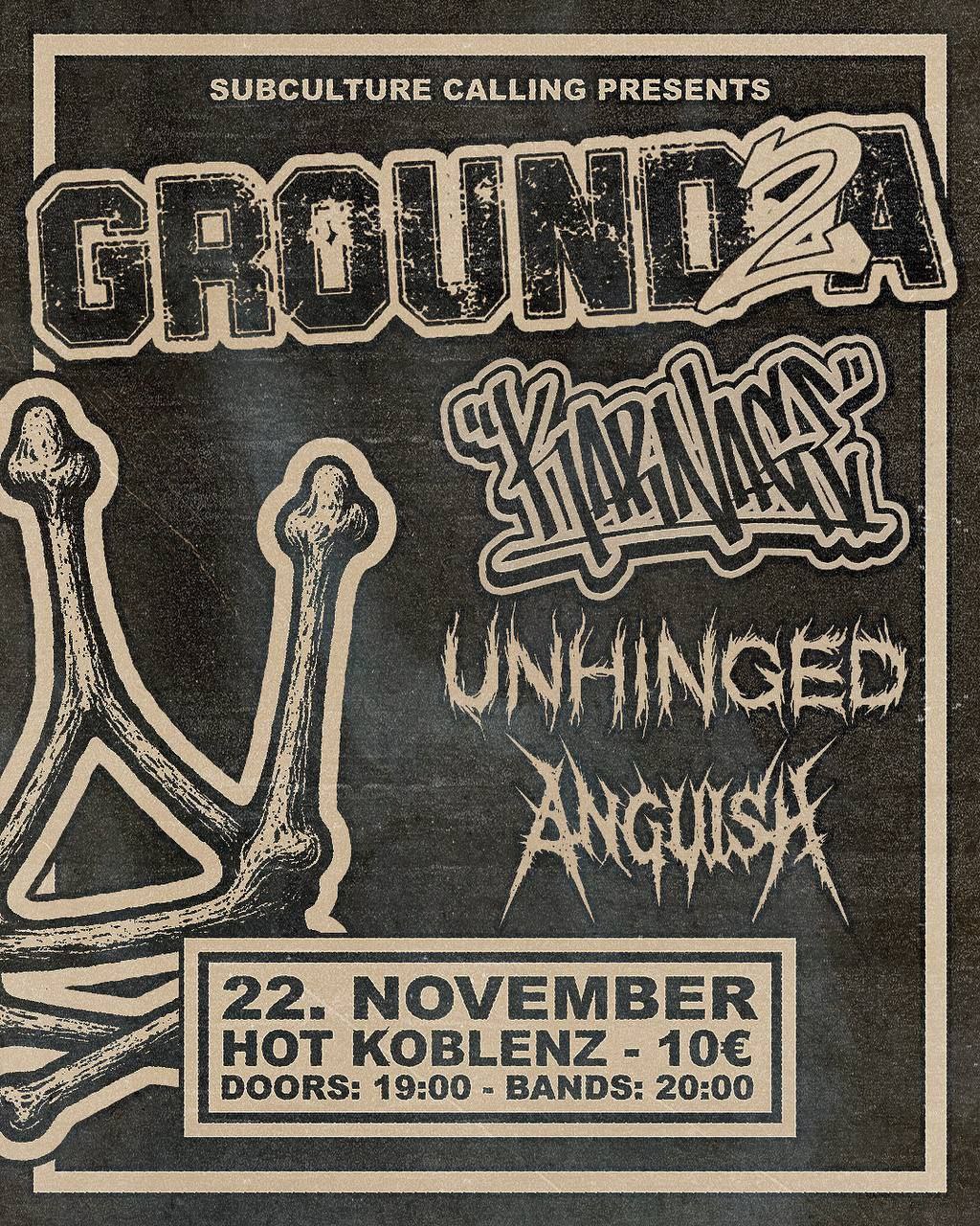 Die volle Packung gibt es am 22.11. im HOT Koblenz mit ANGUISH, UNHINGED, KARNAGE und GROUND2A – ein absolutes Highlight der Konzertszene, das ihr nicht verpassen solltet! Datum: 22.11.Ort:…
