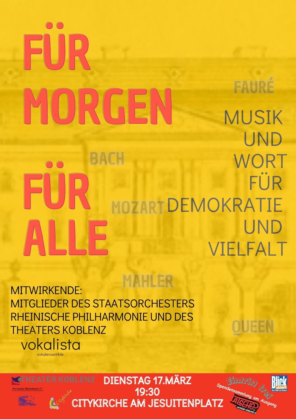 Mit dem Konzertprojekt „Für Morgen. Für Alle.“ setzen Mitglieder des Staatsorchesters Rheinische Philharmonie, des Theater Koblenz sowie das Vokalensemble Vokalista ein kraftvolles musikalisches Zeichen für Zusammenhalt, Menschlichkeit und demokratische Werte.