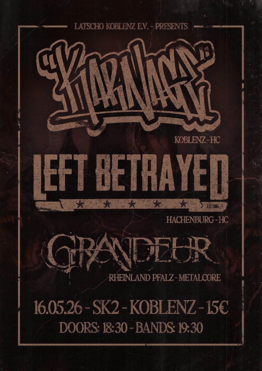 Mit am Start sind LEFT BETRAYED und GRANDEUR, die dem Abend das nötige Bisschen Schmackes verpassen und für ordentlich Druck vor der Bühne sorgen.
